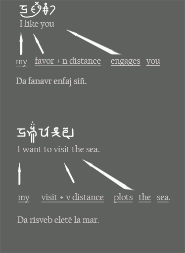 The possessive pronouns we saw in the basic grammar (jda, jdé, jdi, cré, cañjo, jdë and jdir) are also used in spatial grammar, however when they precede the subject, the ‘j’ is usually dropped. Instead of saying “My favor” as “Jda favr”, it’s usual to drop the ‘j’ which would give: “Da favr”. The shorter forms of the pronouns are da, dé, di, cré, cañ, dë, and dir. (The çelloglyphs are the same for the J forms and the shorter forms). In any other part of the sentence however, it’s better form to keep the ‘j’ intact.